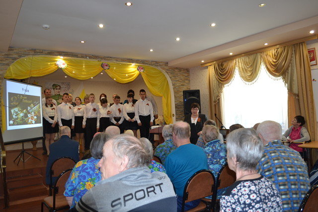 Накануне дня Победы Кольчугинский дом милосердия принимает гостей буквально каждый день. Все спешат поздравить с праздником людей, знающих об ужасах войны не понаслышке. 7 мая в актовом зале нашего интерната тепло от дружеской обстановки и тесно от близости эпох и поколений. С концертной программой «Как хорошо на свете без войны!» в гости к нам приехали воспитанники Кольчугинского дома интерната для детей инвалидов. Ведущая концерта А.Ф.Калатарян поздравила всех с наступающим Днем Победы. В этом году весь свой концерт ребята посвятили нашим кольчугинским героям .В Кольчугинском районе 6 человек присвоено звание Героя Советского Союза. Их подвигам была посвящена медио-презентация. Каждый номер зрители встречали бурными аплодисментами, подпевали ребятам и искренне благодарили их прекрасный концерт. По традиции всем зрителям ребята подарили выполненные своими руками открытки.