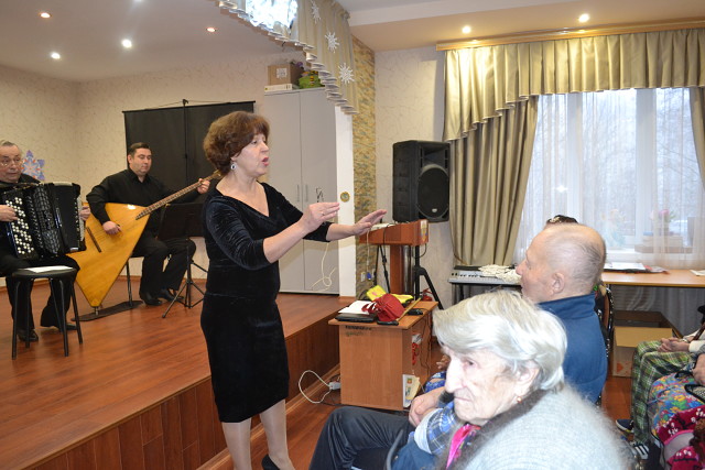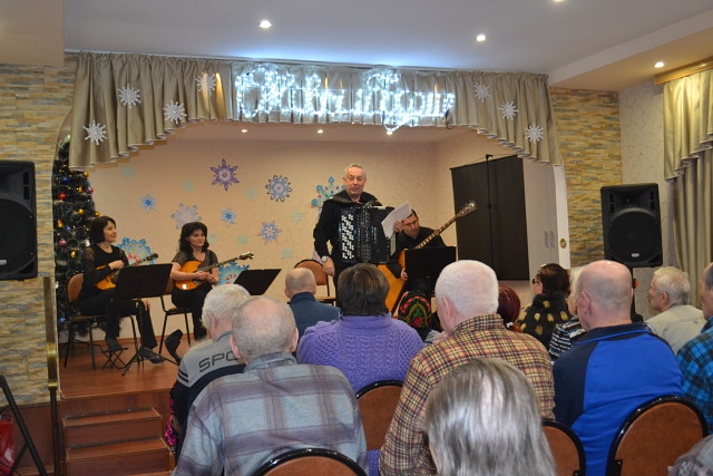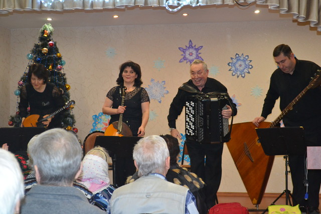 В этом году зима не радует нас снегом и морозами. Слякотная осенняя погода в декабре уже порядком всем надоела. И как новогоднего чуда мы ждем просто снега. А чтобы хоть немного поднять настроение нашим бабушкам и дедушкам 18 декабря с концертной программой в Кольчугинский дом милосердия приехал ансамбль «Родные напевы» (под управлением Валентина Петрачкова). В этот раз коллектив привез много новых музыкальных произведений. Прозвучали и любимые нашими зрителями танго, которые напомнили многим о танцевальных площадках их молодости, и русские наигрыши, и душевные русские старинные, ставшие народными, романсы. После каждого музыкального номера громкими аплодисментами и криками «Браво!» зрители благодарили артистов за их удивительную игру. А песни в исполнении солистки ансамбля Светланы Васильковой вызывали слезы восторга, не оставляя равнодушным ни одного человека в зале. У ансамбля стало хорошей традицией заканчивать концерт общей песней. На этот раз все вместе мы спели любимую с детства песню «В лесу родилась елочка!»